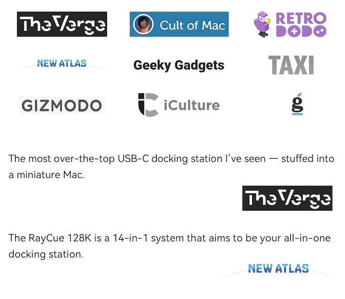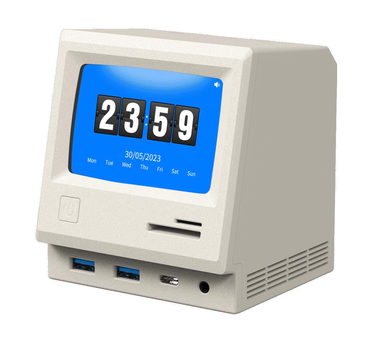 Nothing combines fun, functionality and just the right amount of nostalgia like the RayCue 128K. It looks like a miniature version of the iconic Apple Macintosh yet delivers modern features. A most versatile addition to your workspace, the RayCue 128K  Pro boasts 14 docking ports, speaker, and a cool display ready to show your favorite photos, time, date or any image you desire! Utilizing DisplayLink® technology, it also allows your computer to support 3 external displays. Plus, the RayCue 128K comes with a 7-port portable hub that looks just like a keyboard.  It makes the perfect gift, office conversation piece or productivity splurge for anyone who remembers Apple’s early good old days!