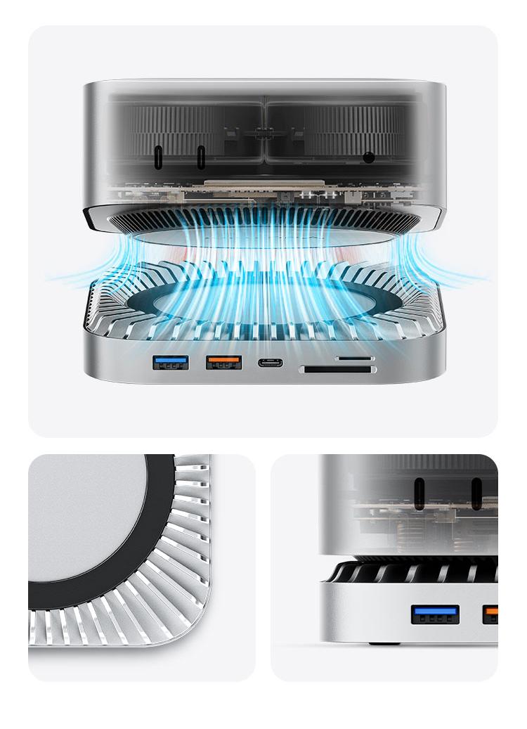 The RayCue Mac Mini Stand & Hub with NVMe Enclosure is the world’s first hub created exclusively for the 2024 Mac Mini. Made withpremium all-aluminum alloy, it not only complements the sleek design of the Mac Mini but also enhances durability and heat dissipation.